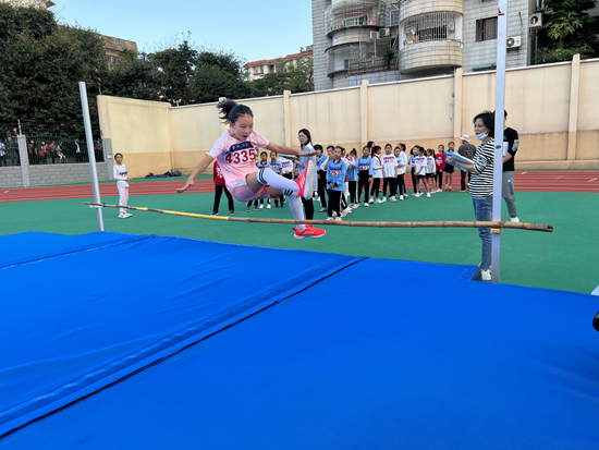 11月9日,福建厦门第二实验小学,一名四年级小学生正在跳高。教育“双减”政策实施以来,福建厦门第二实验小学进一步推行快乐运动进校园学生体育素质教育,通过开展“奋斗吧,追光少年”主题运动会等形式多样的活动,增强学生的身体素质,帮助学生树立“健康第一”的观念和终身体育锻炼的意识。赖小燕/摄