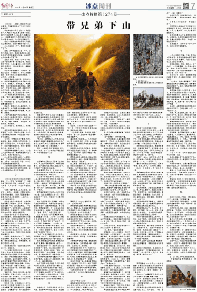 几个战友脱下灭火服,做了一个简易担架,把冯坪坪抱在担架上,小心下山。但走了五六米后,左侧又烧起了几米高树冠火。