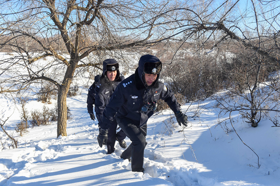 1月9日,内蒙古锡林郭勒盟西乌珠穆沁旗公安局古日格斯台国家级自然保护区迪彦派出所民警在林区徒步巡逻。