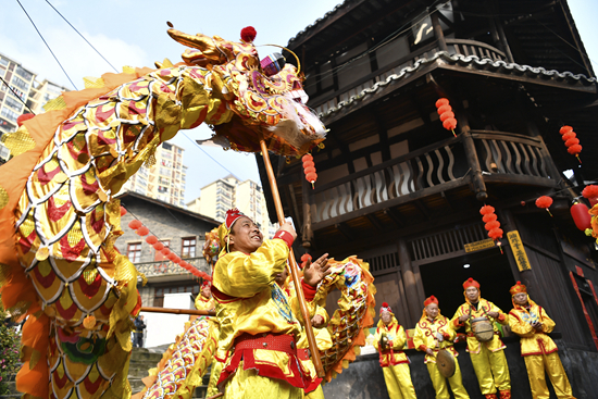 1月9日,四川省广安市前锋区代市镇群众在老街表演舞龙。春节临近,人们以各种形式喜迎佳节,城市乡村年味渐浓。张启富/摄(新华社发)