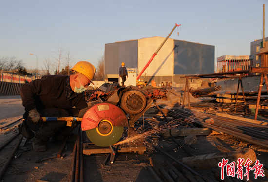 1月2日,北京地铁12号线三元桥站施工现场,35岁的钢筋工甄琦正在进行切割钢筋的作业。中青报·中青网记者 陈剑/摄