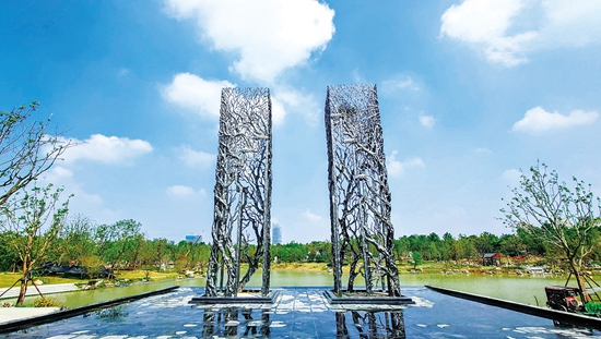 用好自然生态本底。充分尊重园区地理风貌和自然禀赋,遵循“宜林则林、宜田则田、宜水则水、宜建则建”的原则,用好园区内原有生态资源,因地制宜建设生态园林展区,蓝绿空间占比超75%。突出地域特色,不砍一棵大树,不种名贵树种,不搞大树进城,保留乔木近万株,全园乡土树种占比超80%。随形就势打造园区地势形态,搭建生物通道,营造动物栖息繁衍场所,已有超过数十种动物、数百种植物在此栖息生长,园区内生态质量显著提升。