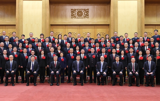 上午10时30分,习近平等来到人民大会堂东大厅,全场响起热烈掌声。习近平等向代表们挥手致意,同大家亲切交流并合影留念。