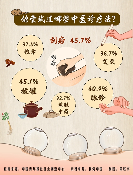 上周,中国青年报社社会调查中心联合问卷网(wenjuan.com),对1000名受访者进行的一项调查显示,74.3%的受访青年觉得自己有中医养生意识,94.0%的受访青年了解过中医养生的相关理念,93.3%的受访青年尝试过各式中医诊疗法。