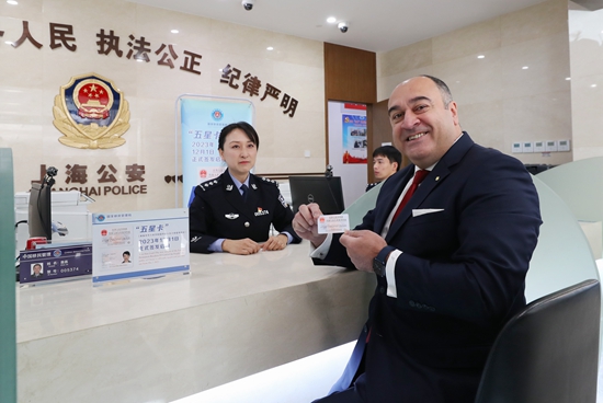12月1日,来自土耳其的伊尔马兹斯南在上海市公安局出入境管理局办证大厅展示他刚拿到的“五星卡”。
