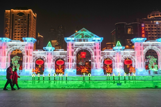 1月3日,旅客经过哈尔滨站站前广场上的冰雪景观。