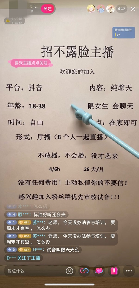 1月10日上午,中青报·中青网记者在一处短视频平台刷到一条“招不露脸主播”的直播,在线观看账号数量有660多,直播页面显示:仅限招募18-38岁的女生,8个人一起纯聊天直播,每月播28天。博主还表示“后半夜3点都能播”。