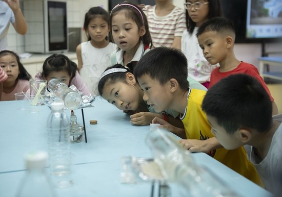 7月10日,在安徽省科技馆,小朋友观察海水淡化科学实验。暑期,安徽省科技馆在常设展览之外开展研学营、科学课程、科学实验等科普活动,让孩子们在丰富多彩的活动中感受科技魅力。新华社记者 傅天/摄