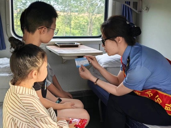 暑运期间,列车上儿童乘客增多。7月26日,由呼和浩特东开往昆明的k691次列车上,中国铁路呼和浩特局集团有限公司包头客运段昆明车队第七乘务组青年乘务员孙雅楠耐心地向小朋友们介绍乘车的安全注意事项。潘健/摄