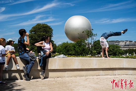 当地时间7月28日,法国巴黎,一名游客在杜乐丽花园外的围墙上倒立,以这种方式与奥运主火炬合影。