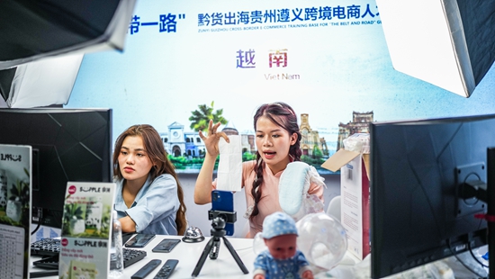 8月21日,留学生在跨境电商展区直播带货。当日,2024中国-东盟教育交流周在贵州省贵阳市贵安新区开幕。今年交流周主题是“深化教育合作、促进人文交流、携手共创未来”。新华社记者 陶亮/摄