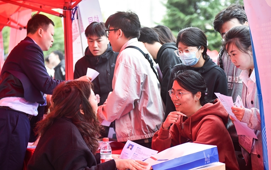 10月19日,在双选会上,大学生求职者在咨询相关岗位信息。