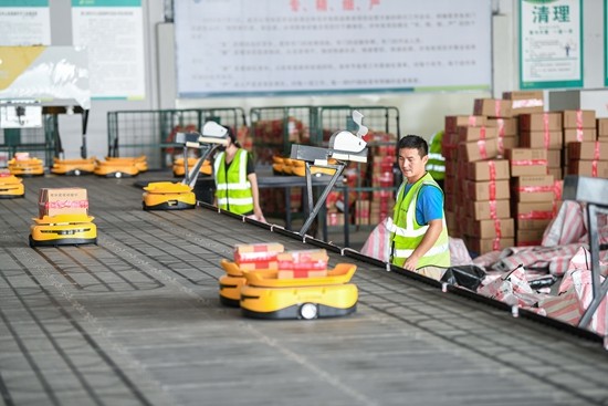 11月13日,在海南邮政海口中免专项处理场地,工作人员在分拣“小黄人”的配合下,将需要邮寄送达的中免免税品包裹进行精准搬运、分拣。视觉中国供图