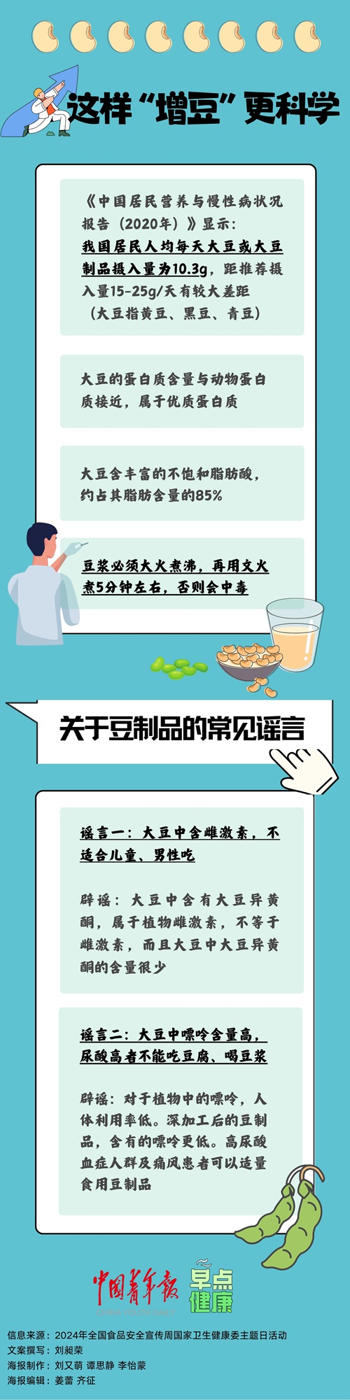 “减油、增豆、加奶”核心信息提示,常吃大豆及其制品对儿童生长发育有益,可降低成年人心血管疾病、乳腺癌、绝经后女性骨质疏松症等发病风险,还有助于延缓老年人肌肉衰减。建议成年人平均每天摄入15-25克大豆或相当量的大豆制品。目前,我国2/3以上的居民未达到推荐摄入量,应适当增加。