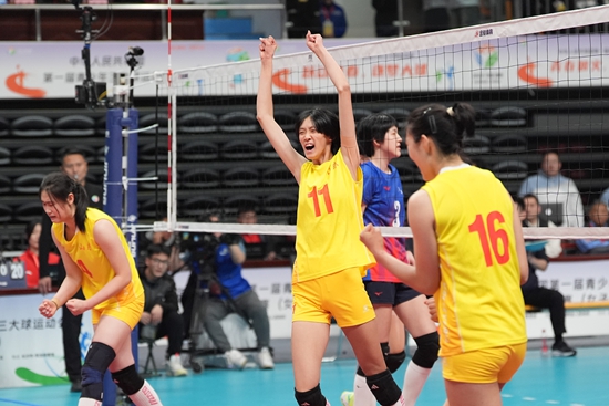 11月27日,山东队球员司静雨(中)和队友庆祝夺冠。当日,在湖南省长沙市贺龙体育馆举行的中华人民共和国第一届青少年三大球运动会排球女子金牌赛中,山东队3比0战胜江苏队,获得冠军。新华社记者 薛宇舸/摄