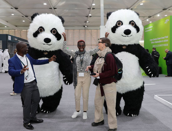 12月2日,在沙特阿拉伯利雅得的联合国防治荒漠化公约大会中国馆,参会者和大熊猫人偶合影。联合国防治荒漠化公约大会中国馆是除东道国之外最大的国家主题馆,举办主题为“跨世纪三北工程 新时代中国实践”的展览,讲述中国人民艰苦卓绝、久久为功的治沙故事。