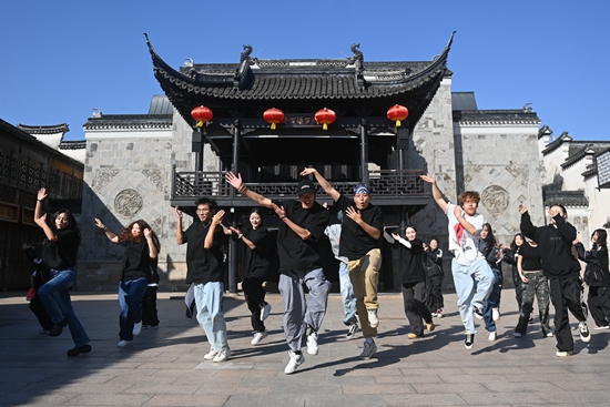 12月8日,大学生在南浔古镇古戏台前表演街舞。当日,在浙江省湖州市南浔区参加2024年中国大学生街舞锦标赛的学生代表受邀来到南浔古镇。学生们以古镇为舞台,即兴表演多场激情四溢的街头舞蹈,为游客带来独特的体验。新华社记者 黄宗治/摄