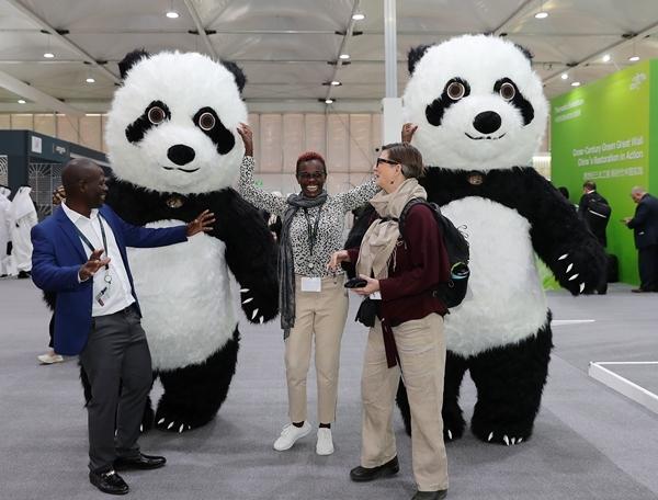 12月2日,在沙特阿拉伯利雅得的联合国防治荒漠化公约大会中国馆,参会者和大熊猫人偶合影。联合国防治荒漠化公约大会中国馆是除东道国之外最大的国家主题馆,举办主题为“跨世纪三北工程 新时代中国实践”的展览,讲述中国人民艰苦卓绝、久久为功的治沙故事。新华社记者 王东震/摄