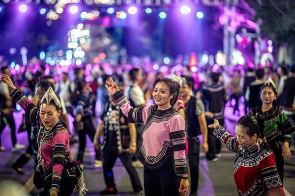 5月1日晚,人们在云南省红河县莲花大道上参加万人乐作舞会。“五一”假期里,各地假日文旅市场活跃,越夜越精彩。新华社记者 胡超/摄