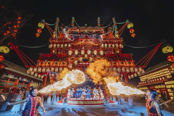 6月2日晚,演员在河北省唐山市丰南区河头老街景区为游客演出。