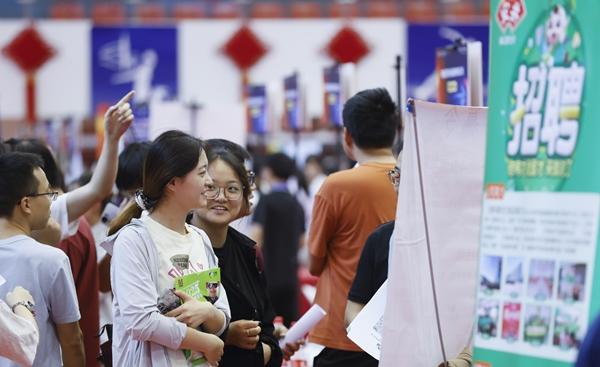 6月8日,大学生在招聘会上求职。当日,江苏省2025届高校毕业生“百日冲刺”暨新型食品、生物医药产业专场招聘会在江苏食品药品职业技术学院举办,吸引240余家优质企业参会,涵盖绿色食品、生物医药、数字经济、电子信息、智能制造等多个行业领域,提供5500余个就业岗位,吸引大量毕业生现场洽谈互选。 赵启瑞/视觉中国