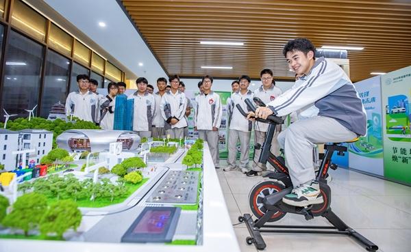 6月23日,湖州长兴职教集团雉山校区学生体验绿色单车游戏,直观感受减少碳排放量并获取碳积分。全国低碳日到来之际,浙江省湖州市生态环境局长兴分局联合国网湖州供电公司走进湖州长兴职教集团雉山校区开展节能降碳主题宣传活动。志愿者们通过绿色低碳宣讲互动、大气监测站点学习参观、碳达人沙盘讲解、减碳游戏体验等方式向青少年普及节能降碳知识。新华社记者 徐昱/摄
