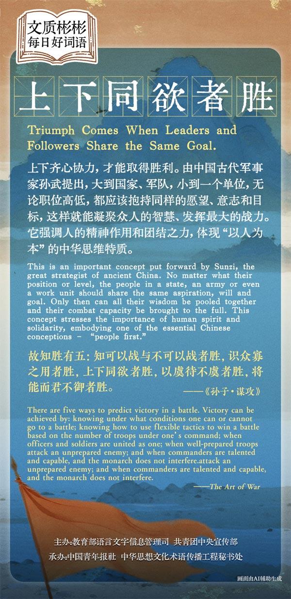 上下齐心协力,才能取得胜利。这是由中国古代军事家孙武提出的重要思想。大到国家、军队,小到一个单位,无论职位高低,都应该抱持同样的愿望、意志和目标,这样就能凝聚众人的智慧、发挥最大的战力。它强调人的精神作用和团结之力,体现“以人为本”这一中华思想特质。