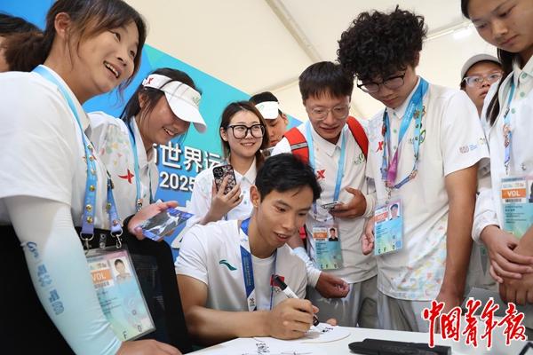 8月14日下午,成都世运会兴隆湖湖滨赛场志愿者之家,世运会武术男子长拳刀术棍术全能冠军高久尚为“小青椒”志愿者签名。