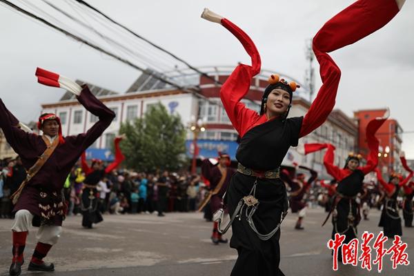 8月20日,青海省玉树藏族自治州囊谦县,当地的年轻人在表演藏族民间舞蹈囊谦卓干玛。