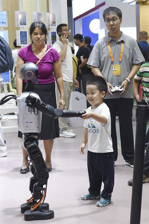 9月13日,在服贸会主题展上,一名小观众与机器人互动。