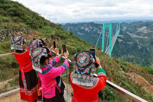 9月27日,人们在参观、拍摄大桥。当日,不少群众来到贵州省花江峡谷岸边参观将于9月28日正式建成通车的花江峡谷大桥。花江峡谷大桥是贵州六枝至安龙高速公路的控制性工程,大桥全长2890米,主跨径1420米,是目前世界山区峡谷第一大跨度钢桁梁悬索桥;其桥面距水面垂直高度625米,是新的世界第一高桥。新华社记者 刘续/摄