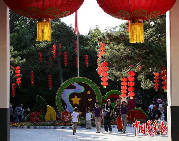 9月28日,北京团结湖公园,市民从五星红旗造景的花坛前经过。国庆节即将到来,首都大街小巷国旗飘扬,节日氛围渐浓。中青报·中青网记者 陈剑/摄