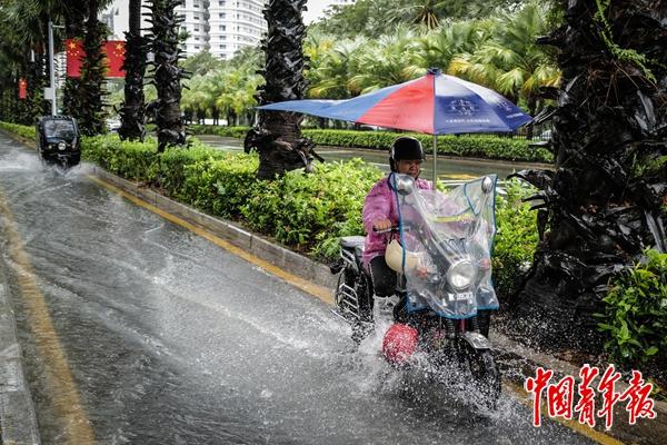 9月28日,海南省三亚市,一位骑车的女士。中央气象台9月28日18时继续发布台风黄色预警。此前一天,海南省防灾减灾救灾委员会将防汛防风应急响应提升至Ⅲ级。三亚市教育局发布停课通知,寄宿制学校学生当晚不返校,9月28日全天中小学校、幼儿园、校外培训机构停课。中青报·中青网记者 赵迪/摄