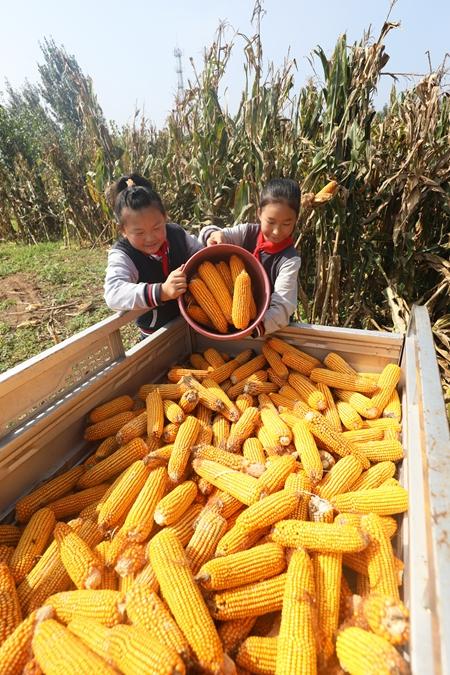 9月24日,河北唐山,丰润区火石营镇东吕各庄小学学生帮助农家将收获的玉米装车。视觉中国供图