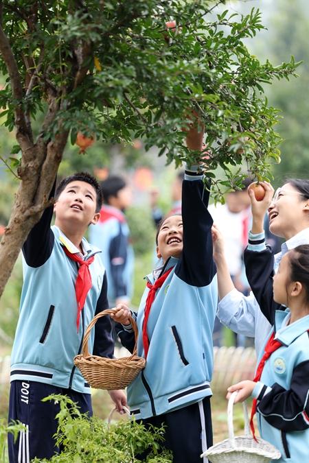 9月23日,第八个“中国农民丰收节”,山东省临沂市郯城县第三实验小学开展校园采摘“庆丰收”活动。学生和老师一起采摘石榴,在劳动实践中欢庆属于自己的“丰收节”。视觉中国供图