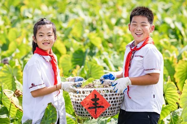 9月23日,江苏南通,海安高新区实验小学学生来到雅周镇许家庄村雅欣合作社,开展“迎秋分·庆丰收”劳动实践主题教育活动。学生在村民的指导下,在田间采收芋头,了解农业知识,体验劳动艰辛,感受丰收喜悦。视觉中国供图