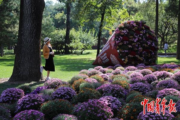 9月30日,北京日坛公园,一位市民在五颜六色的花海中拍照。近期,北京市秋花进入盛花期,各公园景区以花为主题的景观纷纷亮相。中青报·中青网记者 陈剑/摄