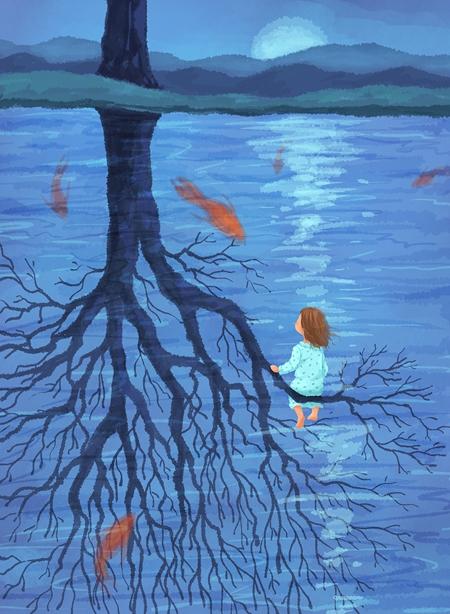 直到菱有些困倦了,外婆的脚步才停下来。她睁开困得半眯的眼,眼前是披麻戴孝的一群人,低低的哀泣声传入耳朵里,孤僻的房子在黑夜燃起唯一的灯火。菱听着细碎悲伤的哭声,人们的眼睛里仿佛有星星在闪烁,却让菱恐惧,她环顾四周,终于明白发生了什么——是死亡。如此寻常的夜晚,却因此变得漫长且悲伤。
