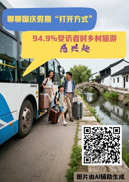 国庆中秋假期进行时,你的假期“打开方式”是什么?经调查,94.9%的受访者对乡村旅游感兴趣,63.7%的受访者觉得乡村旅游能让人感到轻松惬意。打开本期《快看数据》,收获更多发现。和羊驼一起“上班”、仅隔一层玻璃跟熊猫互动、零距离接触小老虎是怎样的体验?《进店吧!青》带你化身“侠客”,在《十面埋伏》拍摄地,舞竹剑、品好茶。扫描二维码,为你呈现AI新视界。