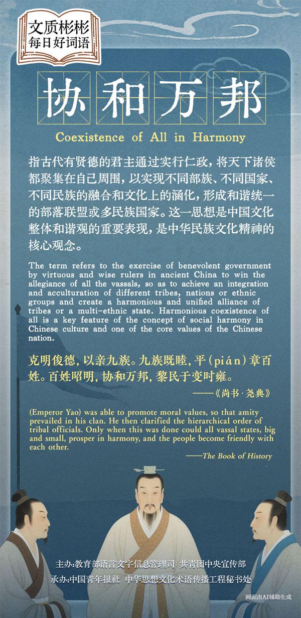 The term refers to the exercise of benevolent government by virtuous and wise rulers in ancient China to win the allegiance of all the vassals, so as to achieve an integration and acculturation of different tribes, nations or ethnic groups and create a harmonious and unified alliance of tribes or a multi-ethnic state. Harmonious coexistence of all is a key feature of the concept of social harmony in Chinese culture and one of the core values of the Chinese nation.