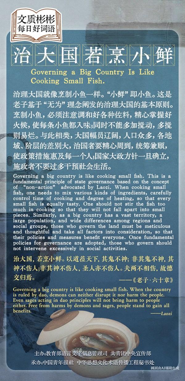 This is a fundamental principle of state governance based on the concept of "non-action" advocated by Laozi. When cooking small fish, one needs to mix various kinds of ingredients, carefully control time of cooking and degree of heating, so that every small fish is equally tasty. One should not stir the fish too much in cooking so that they will not fall apart into small pieces. Similarly, as a big country has a vast territory, a large population, and wide differences among regions and social groups, those who govern the land must be meticulous and thoughtful and take all factors into consideration, so that their policies and measures benefit everyone. Once fundamental policies for governance are adopted, those who govern should not intervene excessively in social activities.