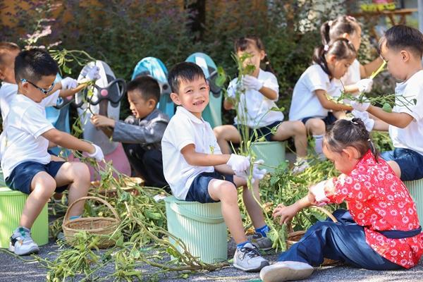 10月10日,浙江省湖州市,德清县下渚湖街道三合幼儿园的孩子们在幼儿园的劳动实践基地采摘青豆。