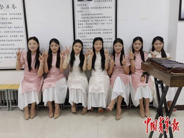 现在杨慧敏不仅是泗州戏社团、磬石琴社团的指导教师,每周都有几次课,还担任着一个班的班主任,算得上是一位“全职”教师。她带出的学生,往往既会演唱泗州戏,又会演奏磬石琴,双技在身,因而更具竞争优势。就在不久前召开的世界制造业大会上,她受邀带着自己的学生前往合肥,在迎宾现场进行非遗展演,获得现场观众的高度评价。