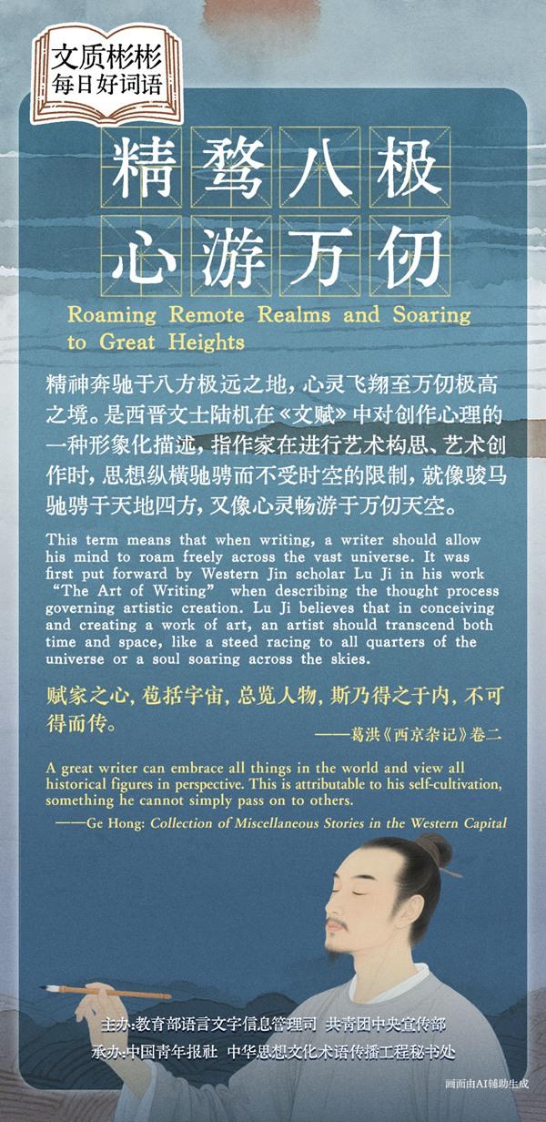 This term means that when writing, a writer should allow his mind to roam freely across the vast universe. It was first put forward by Western Jin scholar Lu Ji in his work "The Art of Writing" when describing the thought process governing artistic creation. Lu Ji believes that in conceiving and creating a work of art, an artist should transcend both time and space, like a steed racing to all quarters of the universe or a soul soaring across the skies.