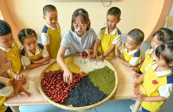 10月16日,在湖南省永州市道县城南幼儿园,老师带着孩子们了解各类粮食知识。