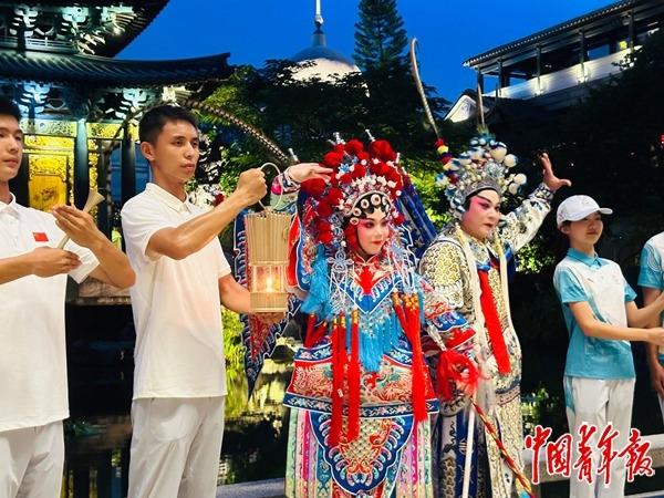 10月16日,十五运会和残特奥会圣火火种走进广州荔湾永庆坊,受到市民游客的热烈欢迎。在粤剧演员的表演中,火种护卫队与火炬团队志愿者展示神圣的火种和火炬,体育精神和传统文化完美融合。中青报·中青网记者 林洁/摄