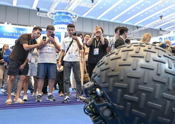 10月15日,客商在第138届广交会服务机器人专区魔法原子展台观看一款球形巡检机器人演示。10月15日在广州开幕的第138届广交会第一期设立服务机器人专区,引入数十家行业领先企业。全球多家工商机构和头部采购商到会参观洽谈。新华社记者 肖恩楠/摄