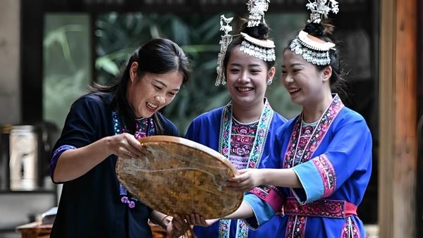 10月17日,在良口乡产口村活动现场,侗族群众在品评制作的食品。当日,广西三江侗族自治县5个乡镇的群众聚集在良口乡产口村,开展形式多样的庆丰收活动。新华社记者 张爱林/摄
