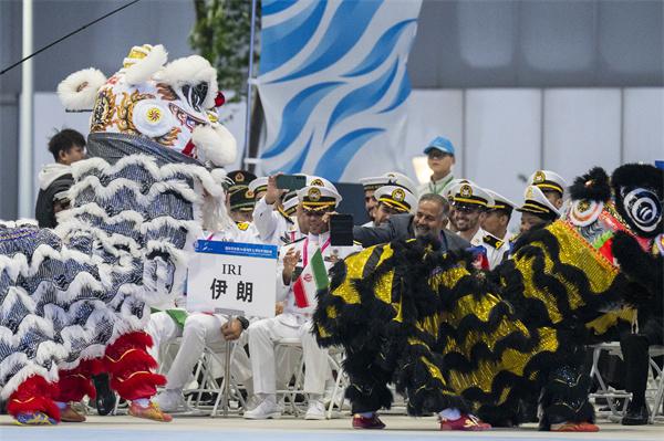 10月19日,外国代表团成员在开幕式上与演出人员互动。当日,国际军体第54届海军五项世界锦标赛在湖北武汉开幕,赛事将从20日起在海军工程大学木兰湖校区举行。本届赛事为期5天,共有9个国家的100余名运动员参加。新华社记者 伍志尊/摄