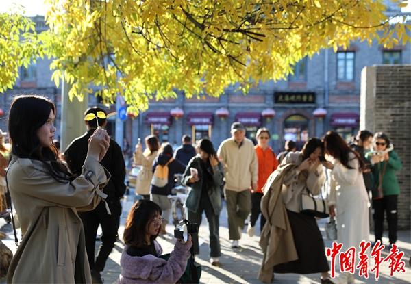 10月20日,北京五四大街,金黄的树叶下,年轻人正在拍照。近日,随着天气的变化,五四大街部分白蜡树树叶逐渐变黄,与附近的历史建筑相映成趣。年轻人纷纷扎堆五四大街,感受老舍笔下的北平之秋,拍照打卡,定格“秋天的童话”。中青报·中青网记者 陈剑/摄